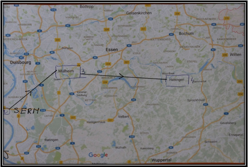 Au bout de quelques km vers Müllheim je ne peux plus marcher, ils me laissent dans le fossé avec des russes qui attendent un camion, j’ai vu Henri de Veiss et nous sommes partis en auto à travers la montagne, le soir on a fait la pose quand même et Le lendemain on a refait de la marche je n’en pouvais plus, j’ai atterris à Hattingen à quelques km de Dortmund Bochum (au sud de Bochum)